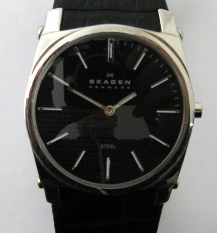 Skagen Design herrearmbåndsur, ref. nr. 859LSLB i urkasse af stål. Sort skive med struktureret segment og stregindikation. Quartzværk. Urkasse diameter 38 mm. Kroko præget læderrem med metalspænde.