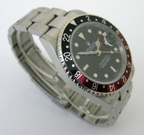 Rolex herrearmbåndsur, model GMT-Master II, ref.nr. 16710, i urkasse med justerbar rød/sort lynette og med oysterlænke af stål, sort skive med punktindeks, datoangivelse ved 3" position, safirglas. Automatisk urværk med selvoptræk. Urkasse diameter 40 mm. Certifikat fra 2005 og brochure medfølger.