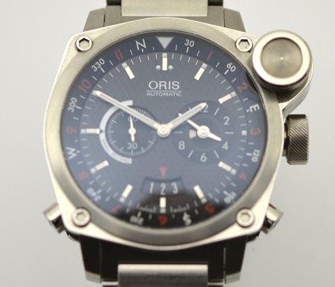 Oris BC4 "Der Meisterflieger" ref. 690 7615 4154, automatikværk, stål kasse, 43 mm diameter, safirglas på front og mineralglas på bagsiden. vandtæt til 100 m. Med det lille ur kl. 3, kan der vises 2 tider på samme tid og kan stilles med trykknapperne ved kl. 5 og 8. Dato vises kl. kl. 6.