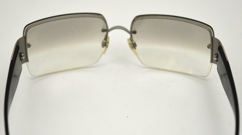 Chanel, dame solbrille med gråtonede glas med overgang til klar. Sorte stænger med logo fremhævet med små "sten"