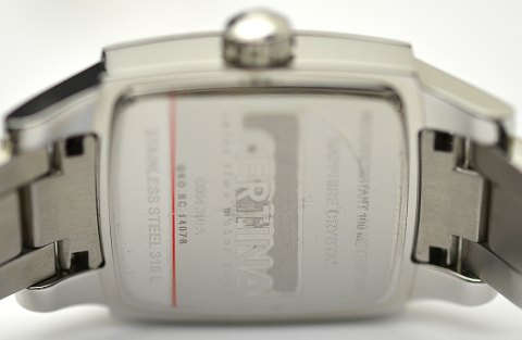 Quartz værk. Stål kasse 25 x 27 mm med perlemor skive med tal og streg index. Safir glas. Dato mellem kl. 4 og 5.