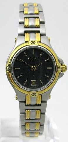 Quartz værk Stål og forgyldning på kasse, 26 mm diameter. Safirglas. Mørk grå skive med forgyldte viser og stregindex. Dato kl. 6. Vandtæt til 30 M