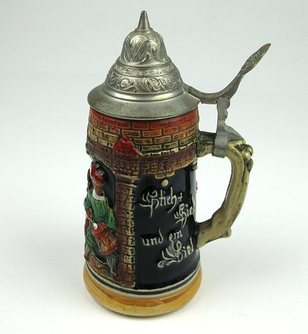 Lågkrus af lertøj, rigt bemalet med middelaldersceneri og vers "Stich und Hieb und Lieb muss ein Landsknecht haben". Låg af tin stemplet DRGM. (mønsterbeskyttet). H. 18 cm. 20. århusndrede.