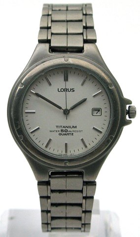 Lorus herrur i titanium med quartz værk. Kasse 35 mm diameter. Grå skive med streg index, dato kl. 3 Integreret titanium lænke. Mineralglas