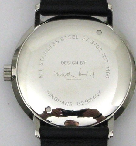 Junghans herreur/unisex, klassisk design af Max Bill. Ref. 027/3702.00. Kasse af stål 34 mm diameter, mekanisk værk med manuelt optræk. Hårdt plexiglas med SICRAPLAN coatning. Sort med tal. Sort klaveskind rem med stål spænde.