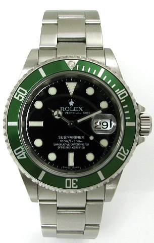 Rolex herrearmbåndsur, model Submariner med grøn lynette, ref.nr.: 16610T, i urkasse og med oyster lænke af stål, sort skive med streg- og punktindeks, datoangivelse ved 3" positionen, safirglas, automatisk urværk. Urkasse diameter 40 mm.