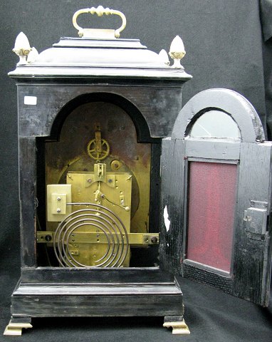 Victoriansk lygteur af sortmalet træ med beslag af forgyldt bronze, strike-silent. Skive mærket Johnson, London, "8 bell chimes", 19. årh. H. 53 cm.