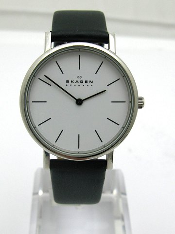 Skagen herre ur af stål, ref. 4746. 36,5 mm diameter stål kasse. Hvid skive med streg index. Quartz værk. Mineral glas.