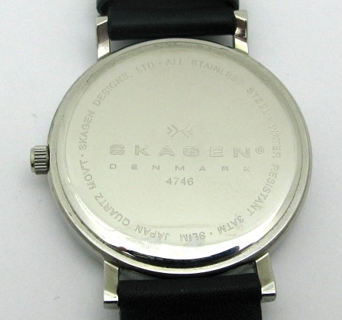 Skagen herre ur af stål, ref. 4746. 36,5 mm diameter stål kasse. Hvid skive med streg index. Quartz værk. Mineral glas.