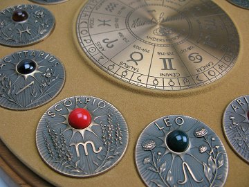 Komplet stjernetegnserie, alle prydet med "ædelsten" i form af smykkesten. I alt 12 medailler i tilhørende showcase af træ i original indpakning og med alle følgepapirer. Hver medaille Diam. 50 mm. Opbevaringssæk af ruskind til hver medaille medfølger.
