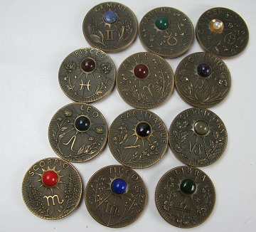Komplet stjernetegnserie, alle prydet med "ædelsten" i form af smykkesten. I alt 12 medailler i tilhørende showcase af træ i original indpakning og med alle følgepapirer. Hver medaille Diam. 50 mm. Opbevaringssæk af ruskind til hver medaille medfølger.