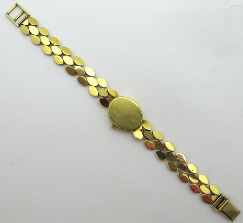 | Dame guldur, 14 Kt med integreret lænke, quartz værk. kasse: 22 x 18 mm. Samlet længde:18,7 cm - vægt: ca. 26 gr.