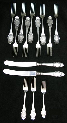 9 stk spiseske. 19 stk dessertske. 14 stk Teske. 9 stk middagsgafler. 2 stk middagsknive. 2 stk frokostgaffel. 1 stk kagegaffel.