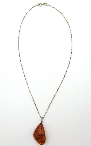 Halskæde af sølv med rav vedhæng. Kædens længde: 42 cm. Vægten på vedhæng: ca. 4 gr. Mål: længde u. øsken 35,8 mm, brede 18,77 mm