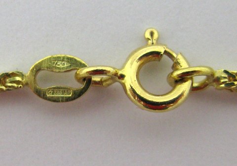 Halsmykke med fast vedhæng af 18 kt. guld. På vedhæng sidder der 3 brillanter: 0,01 ct. 0,03 ct. 0,15 ct. og en facetslebet dråbeformet krystal. Samlet længde: 47 cm og samlet vægt: 24,5 gr.