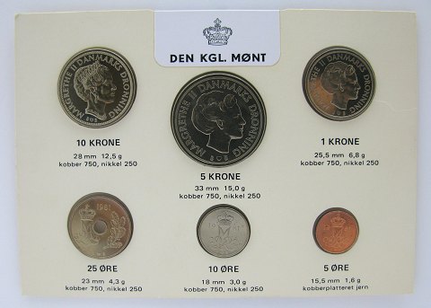 Møntsættet indeholder samtlige mønter i Danmarks møntserie: 10-, 5-, og 1-kr samt 25-, 10- og 5 øre.