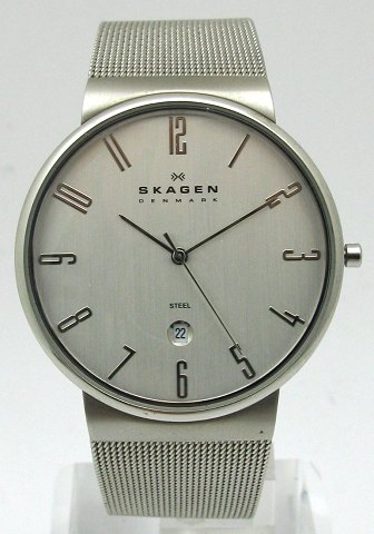 Skagen herreur, af stål med lænke. ref. 355LXSS. 44 mm diameter kasse med hærdet mineral glas. Quartz værk. Sølvgrå skive med tal, dato kl 6.