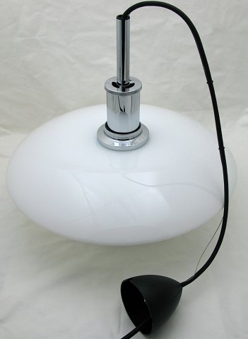 PH Poul Henningsen (1894-1967) 4½-4 pendel med skærme af mundblæst hvidt opal glas, lille afblændingskærm i aluminium og fatningsskjuler i forkromet aluminium. H. 41 cm. Diam. 48 cm
