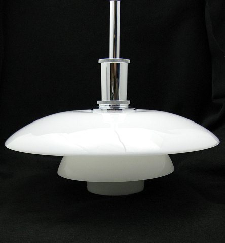 PH Poul Henningsen (1894-1967) 4½-4 pendel med skærme af mundblæst hvidt opal glas, lille afblændingskærm i aluminium og fatningsskjuler i forkromet aluminium. H. 41 cm. Diam. 48 cm