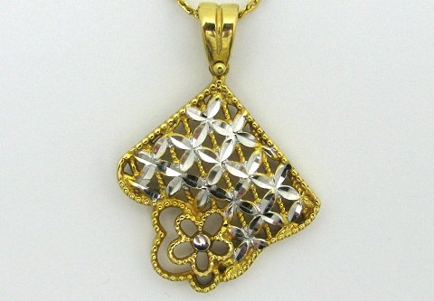 Halskæde af 18 kt. guld med vedhæng af to farvet 18 kt. guld. 55,5 cm. Vægt: 7,5 gr.