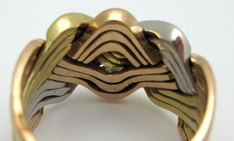 Puzzlering af guld 18 kt. - med 12 led i firefarvet guld.