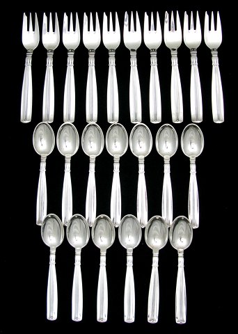 Bestående af 12 middagssker, 12 middagsgafler, 12 dessertskeer, 12 frokostgafler, 13 kaffeskeer og 10 kagegafler. Sølvvægt i alt ca. 2650 gr