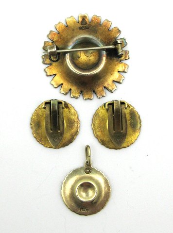 Bestående af broche, par øreclips og vedhæng af sølv med emalje (lettere defekt på 3 dele)