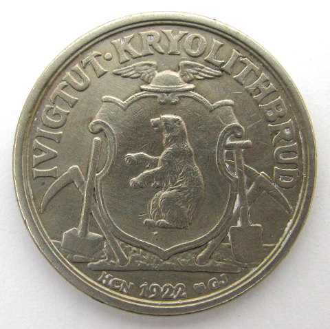 Præget på den Kgl. Mønt i København og har været anvendt i Ivigtut Kryolitbrud indtil 1957, da de blev inddraget, og derefter blev der anvendt officielle mønter.