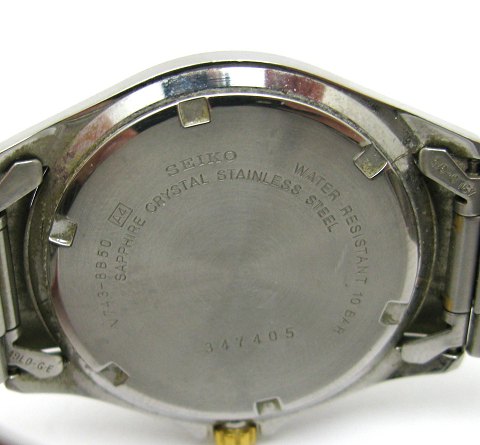 Seiko herrearmbåndsur af stål/forgyldt. kvarts værk. Ref. V743-8B50. Ø 37 mm kasse med safir glas. Hvid skive streg index. Dag og dato ved kl. 3. Vandtæt til 100 m. Lænke af stål/forgyldt.