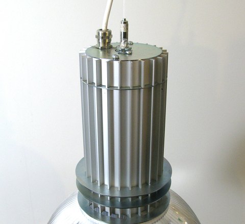 Trendi RIDI industripendel med fatningshus af aluminium og skærm af kanelleret plexiglas. Ophæng med central wire og separat ledningsudtag. Lyskilde: Osram Dulux D/E sparepære som findes fra 10 - 27 Watt. H. 43 cm., diameter 32 cm.