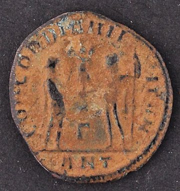 Bagside: Kejser til venstre modtager Victoria på globe fra Jupiter med scepter til højre. Omskrift: CONCORDIA MILITVM. I midten: halvmåne over Gamma. Nederst: ANT.