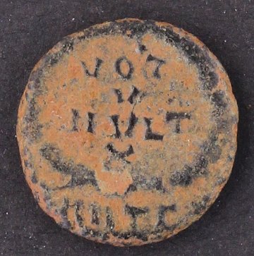 Bagside: VOT V MVLT X i dekorativ krans. ANT Gamma nederst.