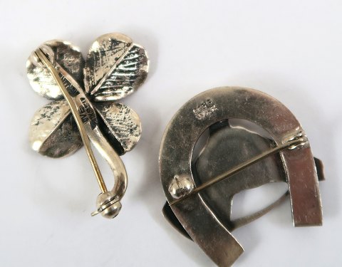 Broche i form af hestesko med hestehoved samt broche i form af firekløver, begge L. 30 mm., vægt 12 gr.