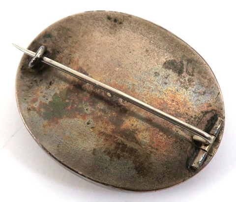 Broche af sølv med perlebort, monteret med ovalt ravstykke 40 x 33 mm., prydet med kors af sølv. Stemplet *L*, 19. årh. slutning.