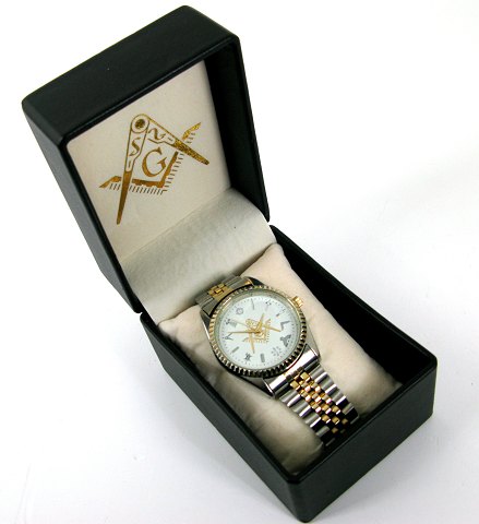Frimurer armbåndsur i urkasse af stål med hvid skive og indikation i form af frimurersymboler, separat sekundviser. Quartzværk. Urkasse diameter 40 mm.