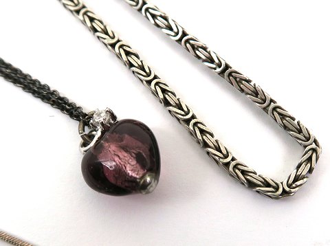 Lot beståendes af sterling sølv halssmykke med jerteformet vedhæng, prydet med hvid safir, L. 42 cm. italiensk kongekæde af sterling sølv, L 55 cm. Defekt kæde med perle og tøndeformede mellemled, L. 40 cm. medfølger.