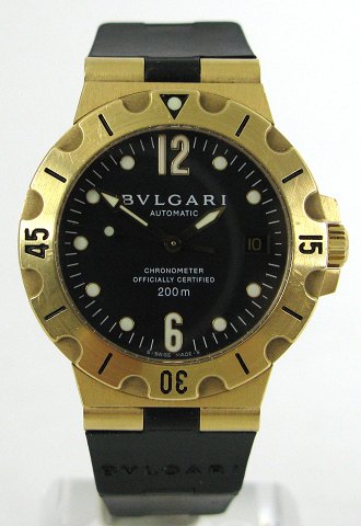 Bulgari Diagano Professional Acqua Automatic i urkasse af 18 kt. guld, Ref. SD38G - sort skive med punktindeks, justerbar lynette, datoangivelse ved 3" position, safirglas, monteret med sort gummirem med originalt Bvlgari spænde i 18 kt. guld. Automatisk urværk. Urkasse diameter 40 mm.