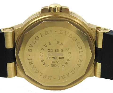 Bulgari Diagano Professional Acqua Automatic i urkasse af 18 kt. guld, Ref. SD38G - sort skive med punktindeks, justerbar lynette, datoangivelse ved 3" position, safirglas, monteret med sort gummirem med originalt Bvlgari spænde i 18 kt. guld. Automatisk urværk. Urkasse diameter 40 mm.