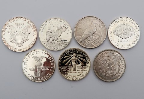 Dollar sølv, årstal 1921, 1925, 1971, 1986, 1987, 1988, 1989. (7)