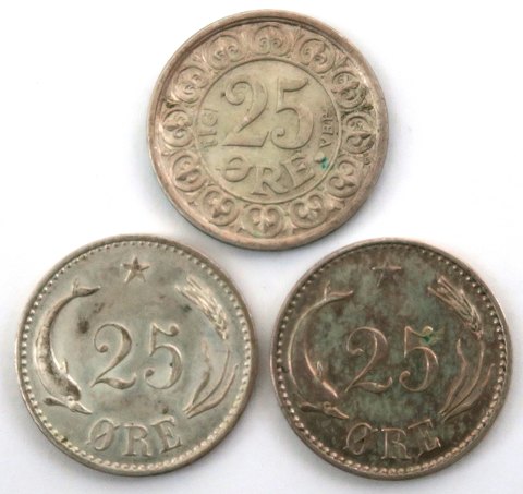 Frederik VIII, 25 øre sølv 1905 samt Christian IX, 2x 25 øre sølv 1911. Henholdsvis H 15 B og H 4