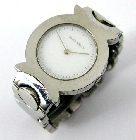 Georg Jensen damearmbåndsur ref. nr. 38606 i urkasse og med lænke af poleret stål. Hvid skive med stregindikation, urkasse diameter 30 mm. Quartzværk. Tre ekstra led til lænken medfølger.
