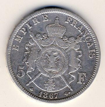 Frankrig, Napoleon III, 5 Franc 1867 SØLV