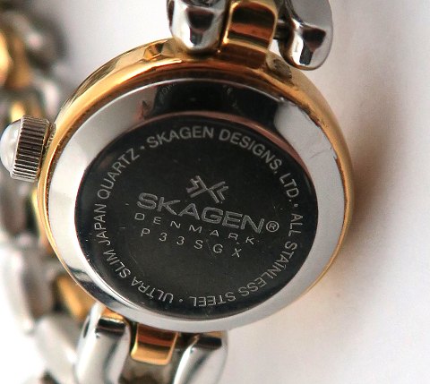 Skagen damearmbåndsur i urkasse og med dobbelt lænke af delvist forgyldt stål. Grå struktureret skive med punktindikation. Quartzværk. Urkasse diameter 15 mm.