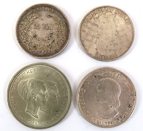 Lot bestående af 2 kr sølv 1892, 2 kr sølv 1953, 5 kr sølv 1964 samt 10 kr 1967