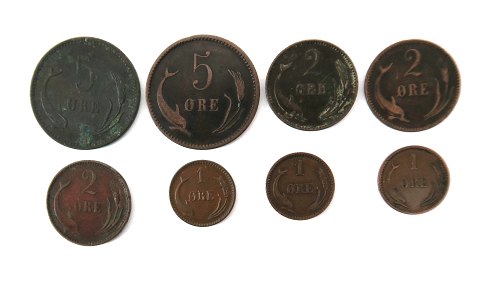 1 øre 1888, 1899, 1902, 2 øre 1892, 1894, 1906 samt 5 øre 1874, 1891. (8)