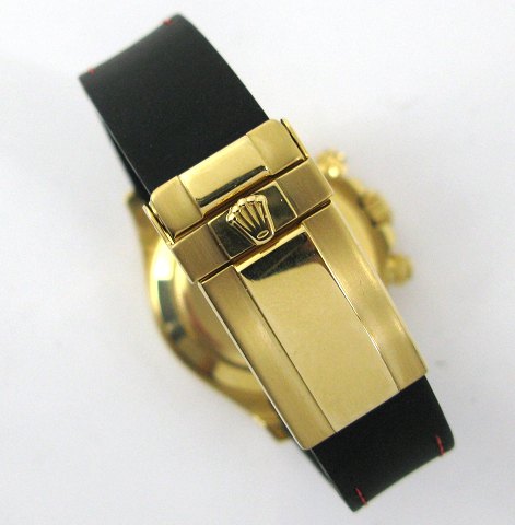 Rolex Cosmograph Daytona, ref. nr. 116518 herrearmbåndsur i urkasse og med remspænde af 18 kt. guld. Lys, metallicgrå skive med arabertal, separat sekundviser, chronograph/tachometer funktioner. Safirglas. Automatisk værk. Urkasse diameter 40 mm. Monteret med stingsyet gummirem af andet fabrikat. (Den originale, oprindelige Rolex Croco rem til udskiftning medfølger).