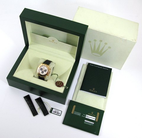 Rolex Cosmograph Daytona, ref. nr. 116518 herrearmbåndsur i urkasse og med remspænde af 18 kt. guld. Lys, metallicgrå skive med arabertal, separat sekundviser, chronograph/tachometer funktioner. Safirglas. Automatisk værk. Urkasse diameter 40 mm. Monteret med stingsyet gummirem af andet fabrikat. (Den originale, oprindelige Rolex Croco rem til udskiftning medfølger).