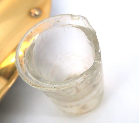 Skrivesæt med to blækhuse af glas på fire fødder. Blækhuse påskruet med skruetyper som var typiske i midten af 1800'tallet. 20 x 16 cm.