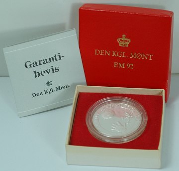 Medaille af finsølv, præget hos Den Kgl. Mønt i anledning af det danske europamesterskab i fodbold, 1992. Ø. 38 mm.