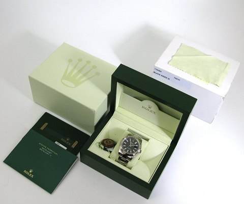 Rolex Datejust herrearmbåndsur i urkasse og med Oyster lænke af stål. Sort skive bag safirglas med stregindikation, central sekundviser og datovisning i #3 positionen. Safirglas. Automatisk værk. Urkasse diameter 42 mm.